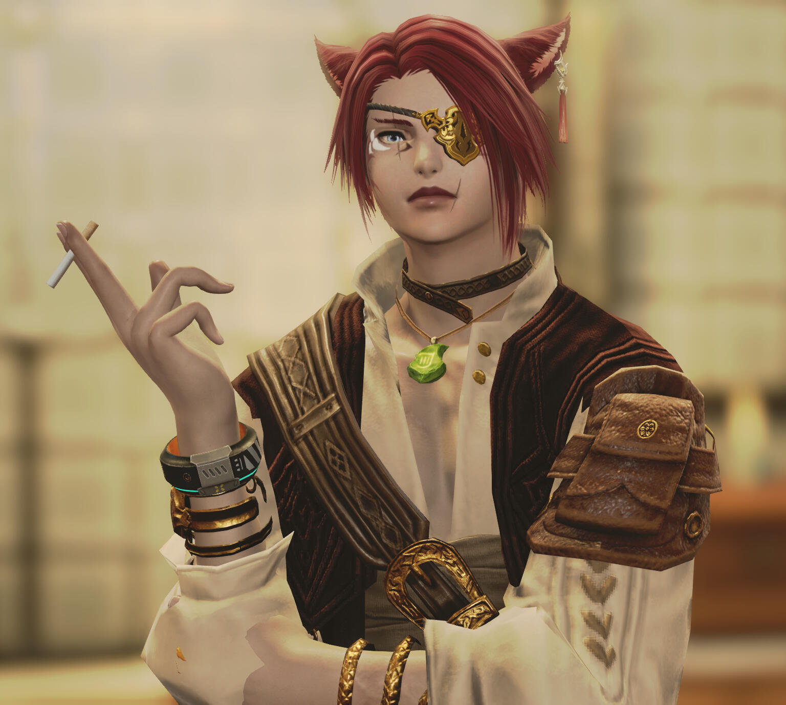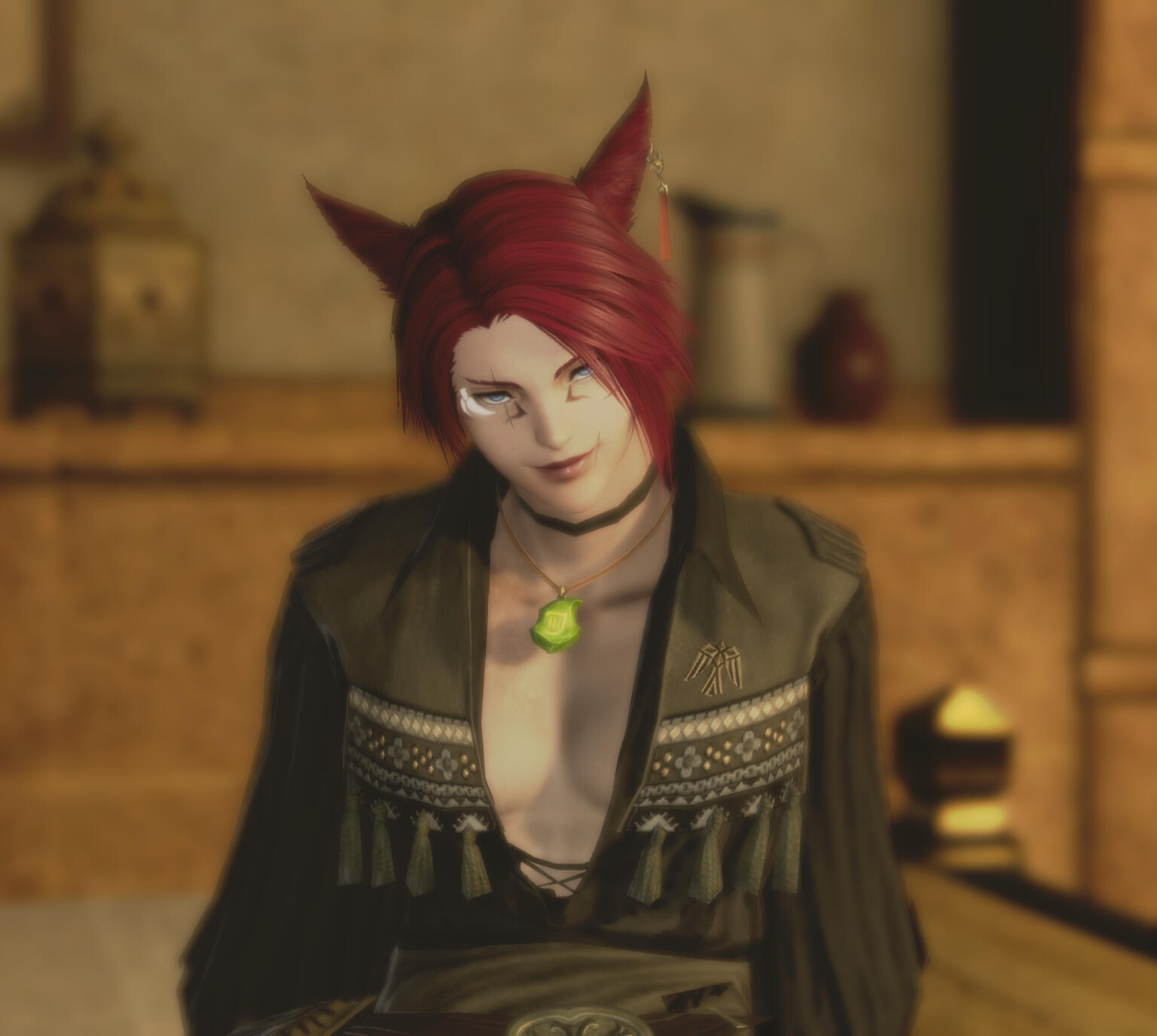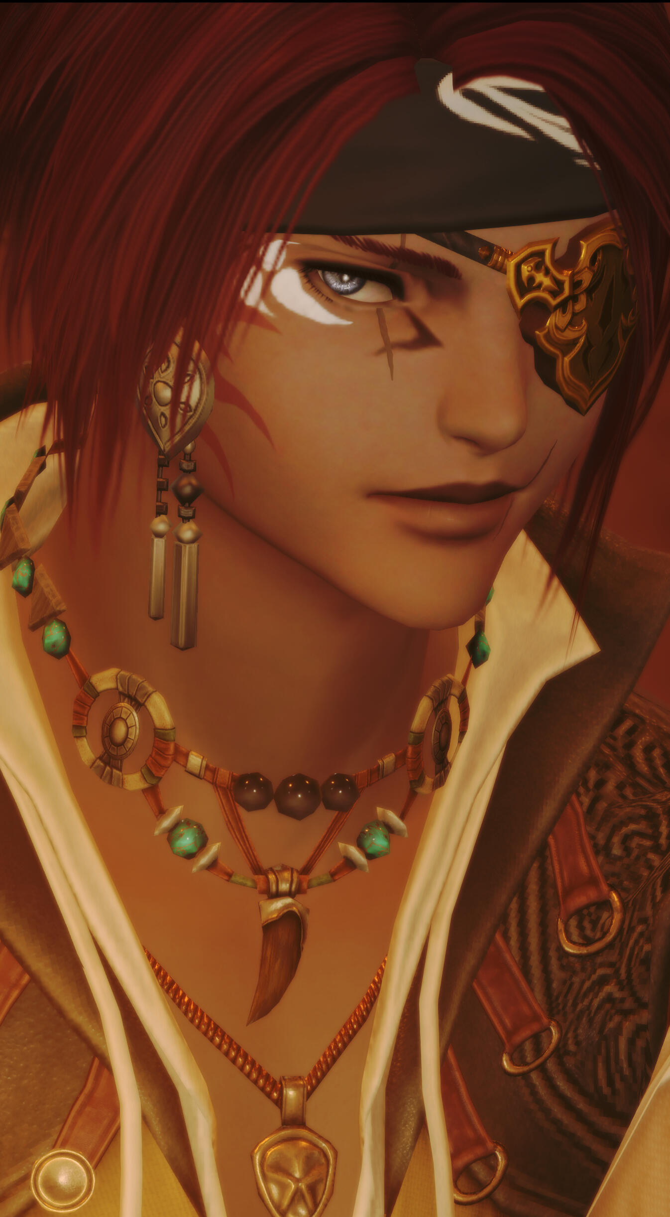 Short red hair frames an angular face, his eyes shining like a winter sky. His skin is dusky as only a child of the moon could be, blemished with scars that appear too deliberate to be gotten in the trials of youth.Sen'ra's right eye is marred by a vertical scar that bisects his eyebrow, though no damage seems apparent to the eye itself. There is a similar slash along his left cheek and another vertical scar at the corner of his mouth, seemingly from the same weapon, all faded with age. Hidden under his hair is an intricate brand on the right side of his face that he endeavors to keep out of sight. Just above the brand, at the outer corner of his right eye is a white tattoo, reminiscent of a flower in bloom.All these marks pale in comparison to the massive coiling scars that spread across his chest, wrap around his arms and stretch all the way to his extremities. These scars do not seem to be made by any weapon or caused by a severe injury, appearing almost as if they were burns of some kind. The tangling track of scars that wrap around his body are oddly similar to the scars that choking vines would leave behind.Though he can rarely be found in garments of Hingan fashion, loose fabrics that obscure his physique, he possesses the figure of a man that works for a living with toned muscles and a trim form. Of late, he's gone back to fashion more common in La Noscea, with loose-fitting shirts and sashes that cinch the waist.