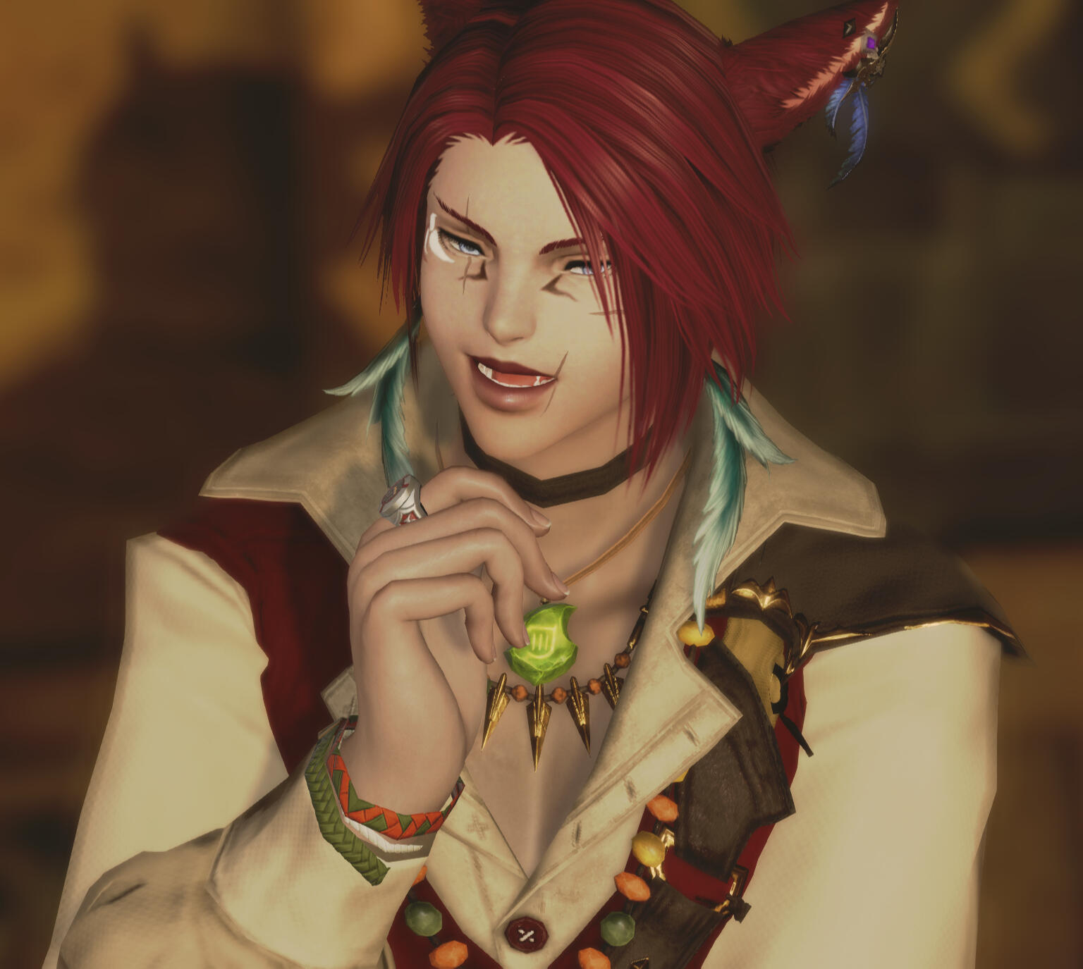 The Tayuun clan of the Valley, tucked deep within the northern reaches of the Black Shroud, possessed little rapport with Gridania and the rest of the forest. Known as little more than a xenophobic group of Keepers, poaching was the least of their offenses. The darkened wood hid the sordid haven of crime that took the values of the Keepers and stretched it to the extremes, behaving as more of a mob than a family. Murder and extortion, blackmail and bribery, these were common occurrences among their ilk.He eventually won free from the Tayuun's yoke and found a temporary home within Gridania, a place where he was confident his family would not dare to follow, as Wood Wailers were no friends to a clan of poachers.He studied conjury for a time before departing the Black Shroud for La Noscea. It was there that he made his first home since departing the deep wood, upon the dark waters of the west.Sen'ra is the current quartermaster of a small crew of 'reformed' pirates and mercenaries, The Steelgrin Sirens, and is patron to a bathhouse in southern Shirogane called The Auspicious Fish.